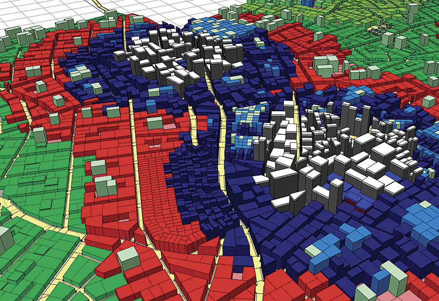 Employing Python scripting allowed staff members to go back and forth between the ArcGIS environment for conventional mapping and CityEngine for 3D modeling. For example, a street centerline was created in ArcGIS and then brought into CityEngine, where curbs, central medians, streetlamps, and trees were added in accordance with the rule file. The result was then exported back to ArcGIS for analysis and mapping. This data was then used to create plots and place building types according to the underlying land use in CityEngine, then brought back into ArcGIS for further analysis.