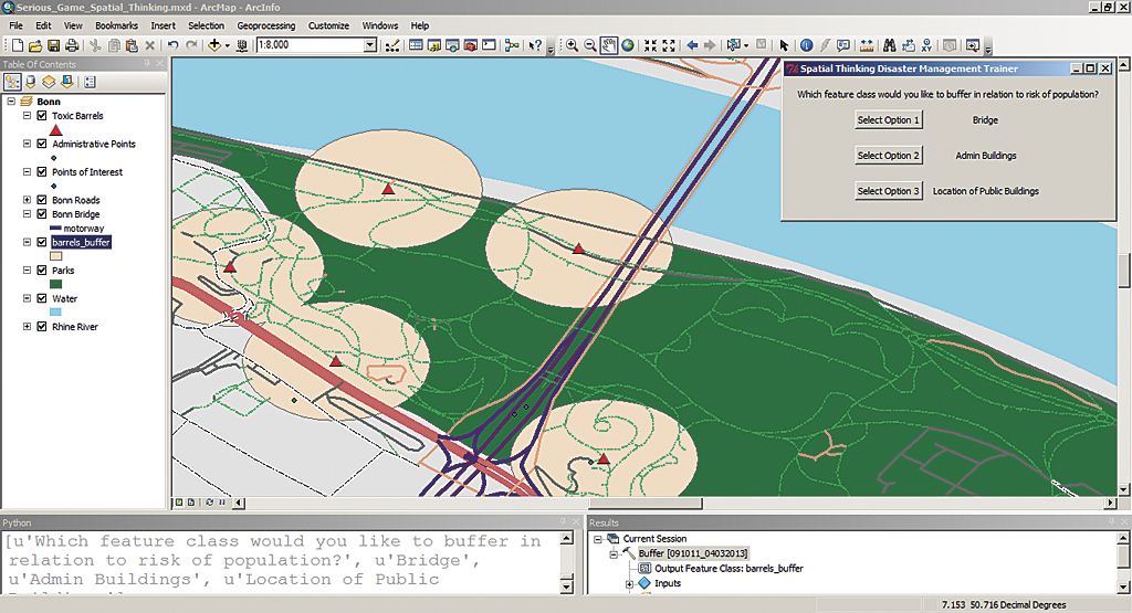 The game uses a disaster response scenario where toxic substances have washed up on the shore of the Rhine River in Bonn, Germany, after a flood. The game player is given a series of questions designed to measure spatial thinking abilities based on which ArcGIS tools they would use to respond to the disaster. Using real GIS data and tools in the game makes it particularly useful for realistic disaster management training. The following sections discuss the game in further detail and provide ideas for future work.