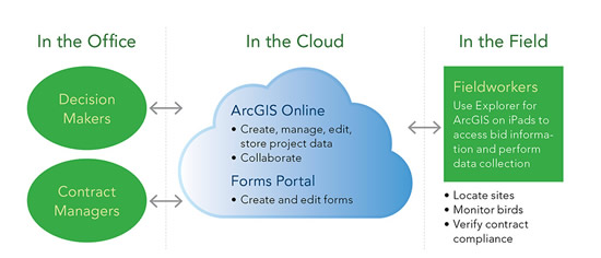 TNC relies on a suite of geospatial, cloud, and mobile technologies to implement the BirdReturns program efficiently—from ArcGIS Online for collaborative web mapping and program design to the Explorer for ArcGIS app, which supports the field teams with an interactive mobile map, to digital forms that are used by field teams to collect data on mobile devices.