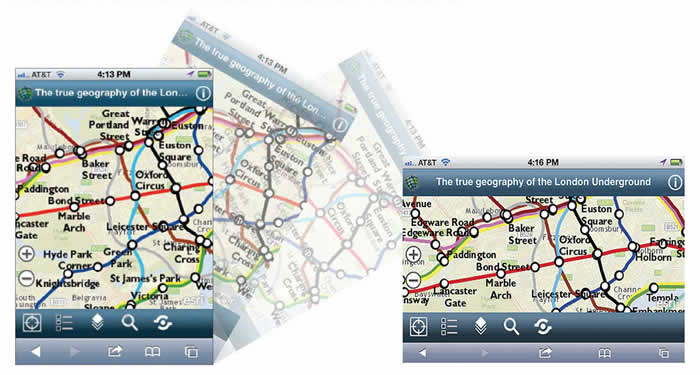 Instead of hard coding the width attribute to a specific resolution (such as 320 pixels), use device-width to ensure there is a one-to-one relationship between the target device and the screen resolution. The width attribute and media queries let you tweak the layout of the application’s user interface (UI) components as the device is rotated. For instance, on a device in portrait mode, the legend is not visible. However, when rotated to landscape mode, the toolbar disappears and the legend becomes visible.