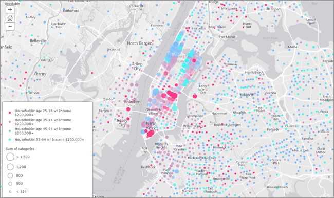 To start, choose an attribute (or multiple attributes), and you’re smart mapping! Once you choose an attribute, smart mapping provides drawing styles based on the type of attribute. For example, selecting a numeric field, such as Median Household Income, provides options known as Counts and Amounts.