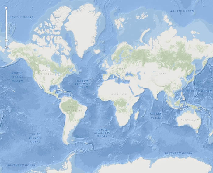 Whether you use Esri’s Ocean Basemap as an online reference map or as a basemap for your own maritime projects, this beautifully designed cached map service renders a richly detailed topography of the ocean floor. You can view bathymetric data, such as depth values in meters, and features, such as trenches, sea ridges, and seamounts. Notable features mapped include Challenger Deep, the deepest known area of the ocean floor, which film director James Cameron visited in March 2012 aboard the deep-sea submersible Deepsea Challenger.