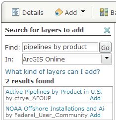 Click the Add button and select Search for Layers from the drop-down list. Search ArcGIS Online by typing in pipelines by product. Click Go.