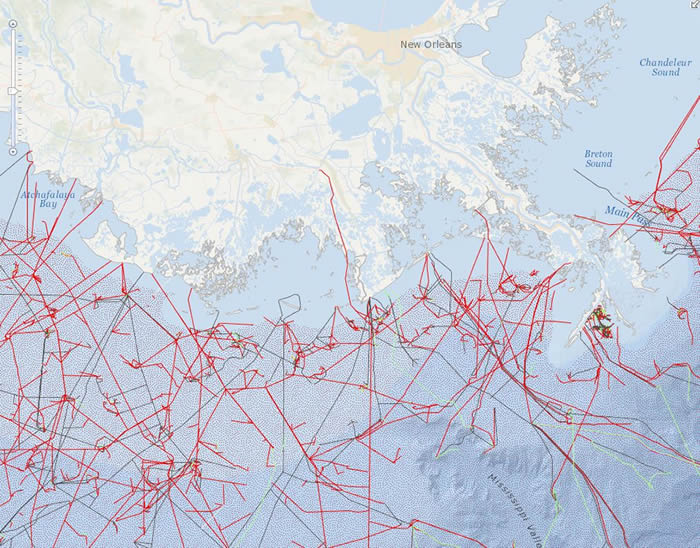 This tip walks you through how to visually analyze data overlaid on the Ocean Basemap. For this scenario, you will use both pipeline and fishing restriction data for the Gulf of Mexico to help you answer two simple questions: How can commercial fishing and the oil and gas pipelines coexist there? And how can the captain of a commercial fishing boat avoid oil and gas pipelines so as not to endanger the crew or vessel or badly damage a cable or pipeline by snagging it with ropes, nets, or anchors? Such an event could be expensive and dangerous to the boat, the crew, and the equipment that belongs to another business (the owner of the pipe or cable). The accident might affect the regional economy if damage to the industrial equipment necessitated a stoppage for repairs, and if a spill occurred, there might be environmental damage.