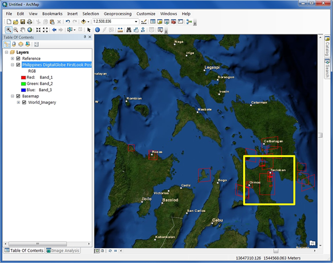 Since this FirstLook service is constantly being updated with new images, there are many scenes stacked on top of each other. This is not always the best way to visualize the imagery. Luckily, the FirstLook service contains all the metadata associated with each scene. ArcMap contains tools to help you better visualize the imagery based on the metadata. In the steps below, you will learn to group the images by date and visualize the scenes over Tacloban City, which was one of the areas hit hard by the typhoon.