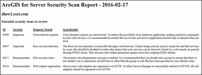 After the tool executes, it returns a report that lists all the recommended actions that you can apply to make your ArcGIS Server site more secure and, therefore, better protect your data and GIS web services. This tip shows you how to run the serverScan.py tool and interpret the results in the report that is generated.