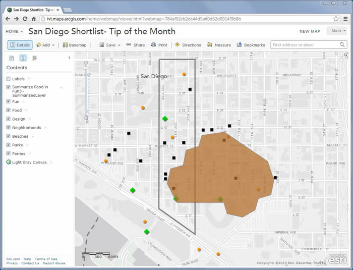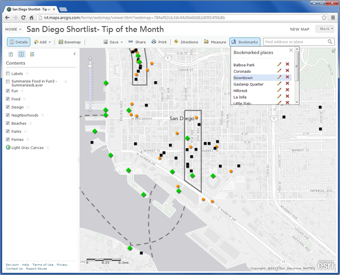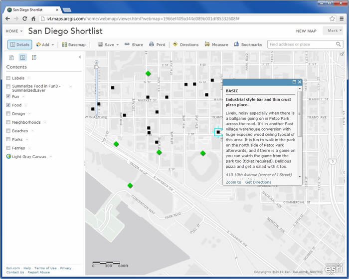 This tip uses the popular San Diego Shortlist web map. The web map was created mainly for people who attend the Esri International User Conference to help them find food, fun, and points of interest in downtown San Diego, California. This tip was designed to help a group of attendees find a restaurant to eat at before going to see the San Diego Padres baseball team play at Petco Park. The restaurant needed to be close to the baseball stadium and easily accessible from the San Diego Convention Center, the site of the conference.
