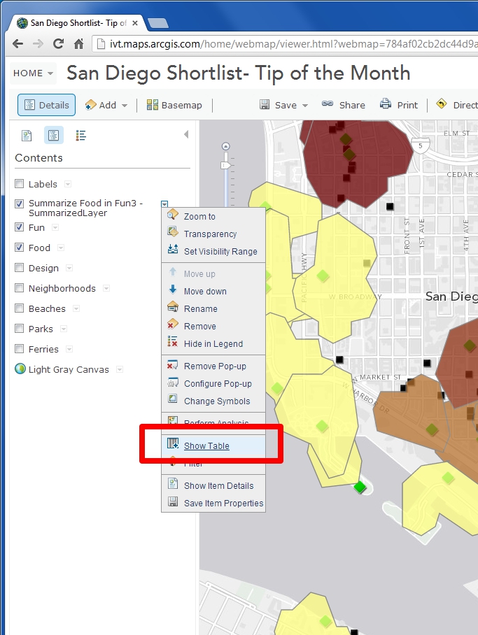 Open the map in the ArcGIS.com map viewer by clicking the OPEN dropdown. You’ll see the map with several layers that show the locations of points of interest or restaurants in San Diego.