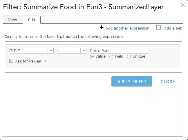 Change the filter with the expression TITLE is Petco Park and click the blue APPLY FILTER button: