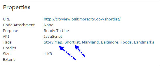 Add tags to your application item details to make them easy to find. Use the term “Story Map” and the name of the template you have used, such as Story Map Tour or Esri Story Map Shortlist. The Story Map team searches for Story Map apps shared in ArcGIS Online by looking for the Story Map keyword. Try the search.