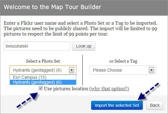 For the purposes of this tip, a map tour of the Esri campus will be created. To start, enter a Flickr user name and choose Look up. The drop down list will display all available photo sets. Choose a set and then click Import the Selected Set.