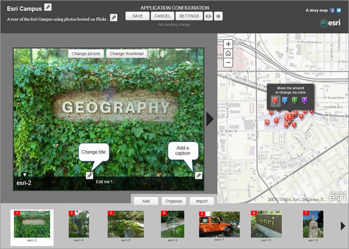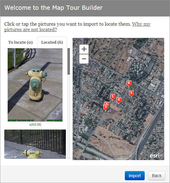 You’ve successfully added your photos to your map. You can make other edits while in application builder mode to complete your tour. You will want to add titles and captions for your photos. You can also reorder them, change the symbol, adjust the location, set the map zoom extent, change the color scheme and layout, add a logo, and more. Experiment with the various options to learn more about what you can do.