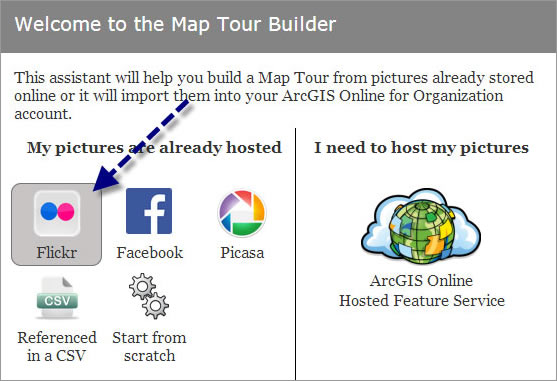 The Map Tour Builder will open automatically. Choose Flickr under the My pictures are already hosted section: