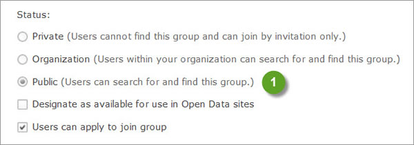 Step one: In your ArcGIS Online organization, go to the Groups tab and click on the group of interest. Click Edit and check the Status section to make sure your group is public. If it is not public, contact the group owner to make it public. If your group is public, hit Cancel at the bottom of the page.