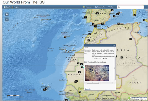 MacLean wondered if there was a way to preserve the images and messages in the Tweets in a form that was easy for people to find and view. He decided to try building a mapping app, which he and his students created using geographic information system (GIS) technology from Esri, online comma-separated value (CSV) files, and Google Docs spreadsheets in Google Drive. Their map displays icons, provided courtesy of the Canadian Space Agency, that look like small space stations. These show the approximate (or, at times, quite accurate) locations of each photograph. Viewers can pan the map, zoom in to any area of interest, and tap an icon. A pop-up window will appear that includes a thumbnail of the picture and the message from the astronaut. You can also click the thumbnail to see the full-size Tweet in the astronauts’ Twitter feed. (Clicking the photo in Twitter will then bring up a larger, sharper image.) It’s a little like seeing photos of landscapes in National Geographic—only taken from space.