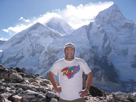Drew Stephens, president of AllPoints GIS, Inc. (Boulder, Colorado), is at Kalapatthar, Nepal (18,600 feet high and 10 degrees F!). From left to right: Mt. Everest West Shoulder, Mt. Everest, and Nuptse. The Khumbu Ice Fall is visible below the West Shoulder. Drew and two friends were the invited guests of Ed Viesturs, a Mountain Hardwear athlete who is currently on a quest to climb all 14 of the world's highest mountains (above 8,000 meters/26,000 feet) without the use of supplemental oxygen. Well, all we can say is that it's a good thing he remembered to wear his circa 1990 ArcInfo T-shirt.
