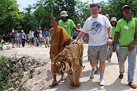 Tom Duryea, senior storage engineer for the U.S. Army Medical Information Technology Center, Fort Sam Houston, Texas, recently visited Southeast Asia, with his Esri T-shirt he stopped by the Wat Pha Luang Ta Bua, or Tiger Temple, in Western Thailand. Of course, he had on his 25-year-old ArcInfo T-shirt! |