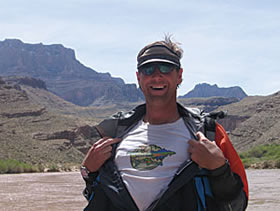 Aaron Seifert, GIS coordinator, Shephard-Wesnitzer, Inc., Flagstaff, Arizona, with his Esri T-shirt, visited the inner gorge of the Grand Canyon as a member of a survey team to map the backwater beaches in the canyon after 2008's artificial flood of 41,000 cubic feet of water per second. |