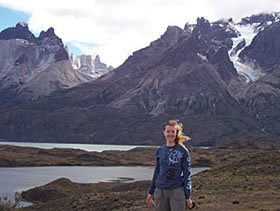 Connie Kilgore, GIS technician, Baxter & Woodman, Inc., Mokena, Illinois, is shown here at Torres del Paine National Park in southern Chile. She was volunteering with Conservation VIP to work on hiking trails. Her Esri shirt isn't exactly a regulation T-shirt, but it'll certainly pass. |