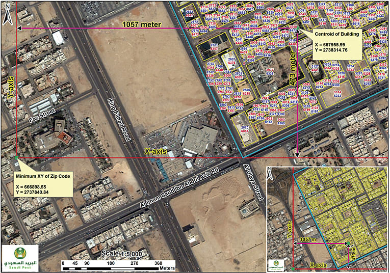 With the launch of the Unified National Addressing System, Saudi Post began assigning postal addresses by calculating x-coordinates with an absolute value between 2000 and 5999 and y-coordinates with an absolute value between 6000 and 9999 for each location inside the kingdom. The x-coordinates are the building numbers. The y-coordinates are the additional numbers for buildings that face an east-west road. Conversely, for the buildings that face a north-south road, the y-coordinates are the building numbers and the x-coordinates are the additional numbers. Also, the building is assigned an odd number if it is on the right side of a north- or eastbound road, and the building is assigned an even number if it is on the left side of a north- or eastbound road. This way, Saudi Post succeeded in assigning a unique and systematic postal address for each location inside the kingdom, with each 13-digit address consisting of a unique combination of 5 digits for the postal code, 4 digits for the building number, and 4 digits for additional numbers.