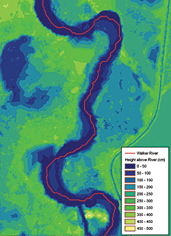 The HAR method described here produced maps that were smoother, easier to interpret, and required less time to produce than ones created using comparable one-dimensional methods. All calculations were performed using ArcGIS and the Spatial Analyst extension and did not require fieldwork. The kernel size can be adjusted to vary the extent and smoothness of the height-above-river map. Larger kernel sizes incorporate longer stretches of the river into the calculation allowing greater mapping extent and a smoother surface. A smaller kernel size results in a smaller extent but more detailed and more precise estimates.