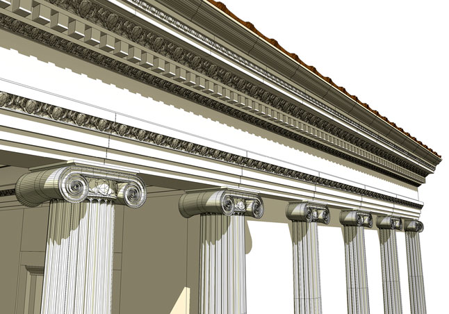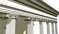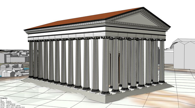 Besides the domestic buildings, CityEngine was applied to reconstruct the numerous temples built by the Romans. The Ancient temples were built by closely following the structured and well-described rules of classical architecture. Thus, one grammar rule set was written to generate Ionic and Corinthian temples. The rule set is highly detailed and contains almost one hundred attributes which can be altered to control the final appearance. But often, due to ruination, not all attributes, such as the capital height, are known. Therefore, the proportions as described by famous Renaissance architect Palladio can be easily implemented in the rule set. Consequently, the user has to only enter the few parameters he knows and the remaining parameters are then calculated proportional to the known parameters.