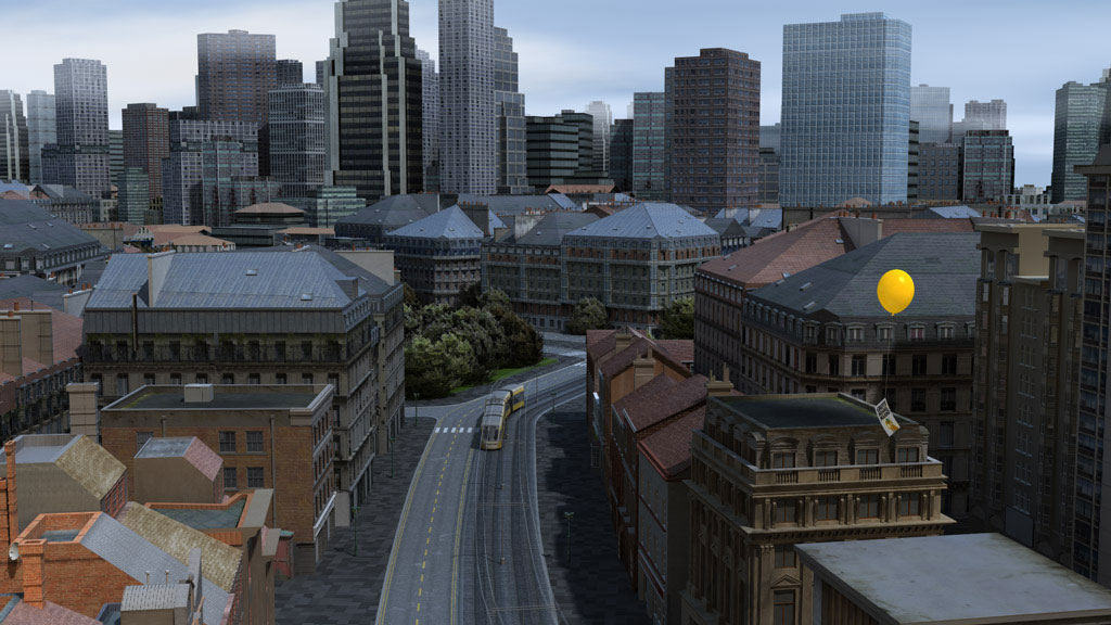 At the render farm, after editing, the CityEngine building models behaved very well. They are detailed where they are close to the camera, and become gradually less hi-poly where they are further away. For extra intimacy in the foreground, custom streets with trams and extra buildings were added. Although being close to 1GB in size including more than 300 different textures, test-rendering in Rebusfarm and some sequential upscaling or downscaling of UV's, were fast and without any problems. Therefore, an appropriate (global illumination) render setting wasn't hard to find. Meanwhile, the support team was very alert and helpful in solving issues that a production of this scale certainly encounters.