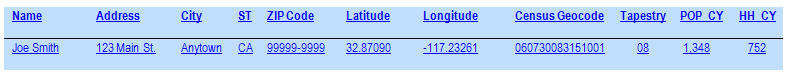 Step Three: Demographic DataAfter Joe's record was geocoded with latitude, longitude, and census geography codes, demographic data can be added to reveal even more about "who" he is based on the profile of his neighborhood. Esri's Updated Demographics variables, such as age, income, housing type, gender, race, and family type, help more fully describe the types of people who live in an area. As you can see in the example below, adding demographic data such as the current year population (POP_CY) and the total number of households (HH_CY) provides information that analysts can use to learn more about residents and the size of their neighborhoods. This additional data shows that in Joe's neighborhood, there are 1,348 people who live in 752 households.
