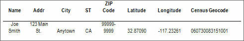 Step Two: GeocodingThis process adds detail to Joe's address information by assigning a latitude-longitude coordinate to his address record. Codes such as state, county, census tract, block group, and block are geographic boundaries used by industries and governments for all state, county, and federal surveys, analyses, and evaluations. A block is a 15-digit code that represents an area the size of a city block. However, in more rural areas, this geographic area may be larger. The block is the smallest level of geography for which the Census Bureau tabulates data that is collected during a decennial census. When the geocode is added, Joe's address record looks like the illustration below and indicates his physical location.