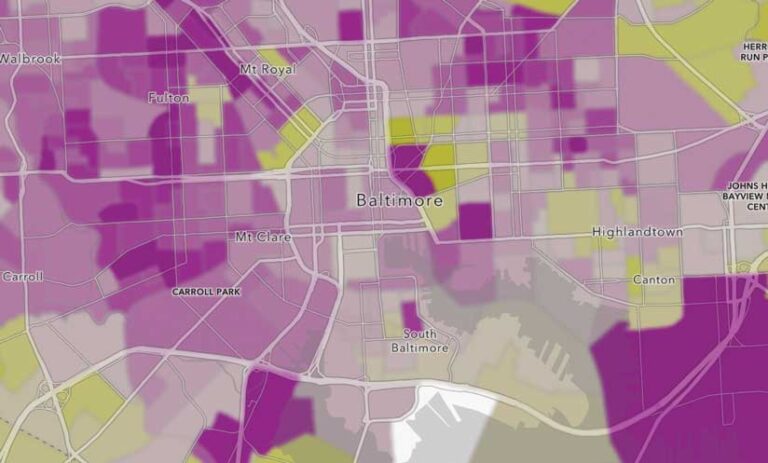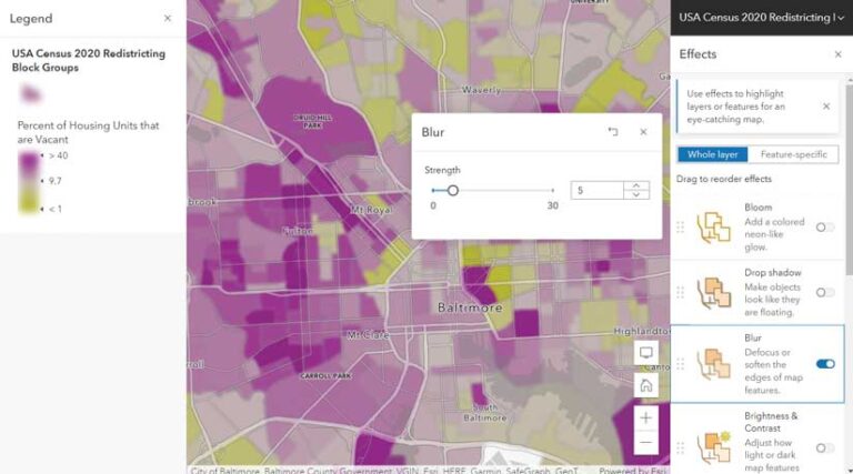 Blur is the perfect effect for data that has been protected with differential privacy. Blur provides a visual cue to anyone reading your map that things aren’t accurate at the individual block, block group, or even tract level. Figure 1 is a map of housing vacancy rates at the block group level in Baltimore, and the blur effect was not applied.