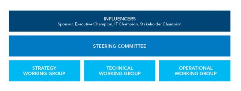 To bring it all together, an effective governance program requires a strong management structure. This means organizing stakeholders into meaningful teams and establishing clear reporting relationships. While there is no single management structure that works for all organizations, a three-tiered structure is common. The first tier is a group of influencers (e.g., sponsor, executive champion, IT champion, and stakeholder champion). The second tier is a steering committee. The third tier typically consists of strategy, technical, and operational working groups.