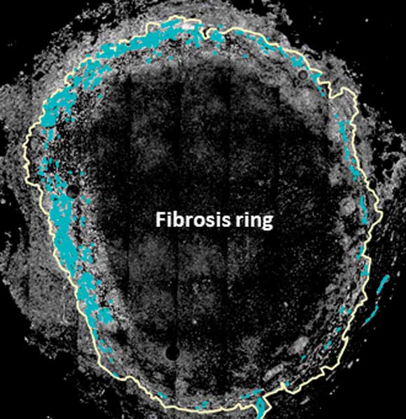 “Using the power of ArcGIS classification algorithms and by applying Cartesian coordinate systems, we are among the very first to create a novel pipeline for spatioquantitatively defined cellular patterns within granulomas,” said Butler. Several different image classification techniques were used—support vector machine (SVM) and random tree—on a variety of granuloma images. These supervised machine learning techniques require training sample files. These training files were created by selecting as many as 100 sample sites of the different cell types.