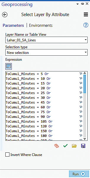 Click the Map tab on the ribbon and click Select By Attributes. Specify Lahar_01_SA_Lines as the Layer Name, set Selection type to New selection, and open the Expression window, which could be used to create the expression by clicking 5 for the first value, and clicking Add and continuing the process to create a similar expression for the rest of the 21 elapsed time intervals listed in Table 2.