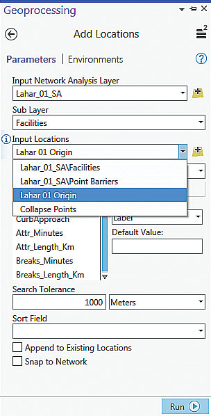 In the Geoprocessing Add Locations pane, set Input Network Analysis Layer to Lahar_01_SA, set Input Locations to Lahar 01 Origin. Set Search Tolerance to 1000 Meters, leave Append to Existing Locations and Snap to Network unchecked, and leave other fields unchanged.