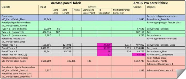 - How many plans, points, lines, and parcels were migrated from the ArcMap parcel fabric to the ArcGIS Pro parcel fabric?