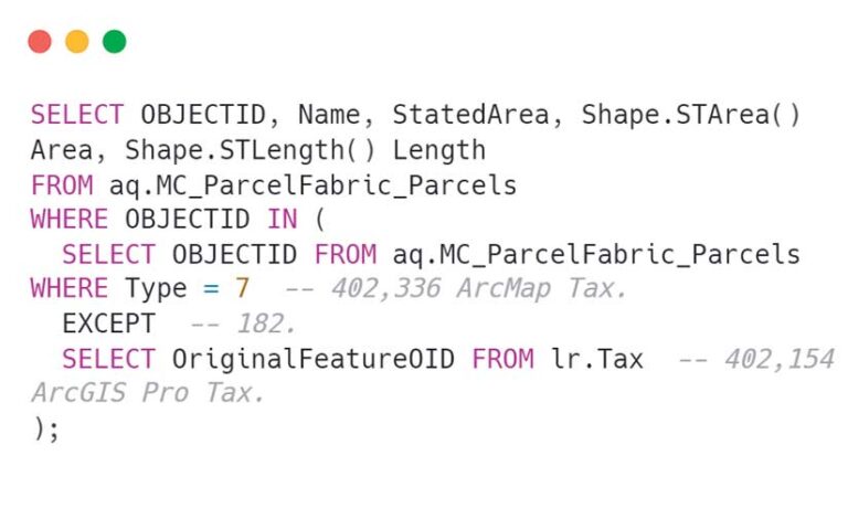 The difference between the number of ArcMap and ArcGIS Pro parcels was 182. Why didn’t these parcels migrate? He ran the SQL statement shown in Listing 2 and found that all 182 tax parcel polygons had zero area and perimeter length so that they did not migrate.