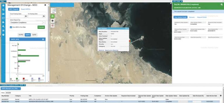 The MOC application provides requested functionality and addresses concerns raised by management and technical staff. The GIS dashboard provides management with selectable charts and tables, so the progress of normal and emergency changes can be immediately monitored, and compliance can be ensured. These changes are extracted from the ERP system so that MOC acts as a gateway for browsing information without logging in to the system.