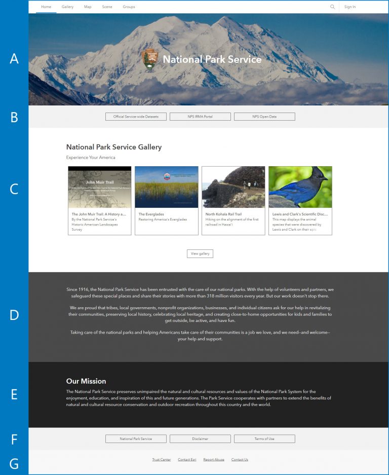 Welcome visitors and members to your ArcGIS Online organization with a striking new home page. The home page editor makes it easy to build a modern, scrolling home page with galleries that showcase your important maps, apps, and layers and provide convenient access to them. The new home page displays beautifully across device types and meets accessibility requirements.