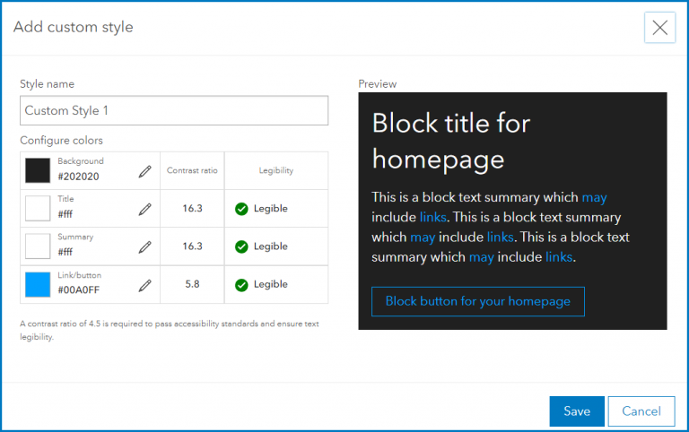 - Content blocks—Configure blocks that include text, items in ArcGIS Online groups, or links.
