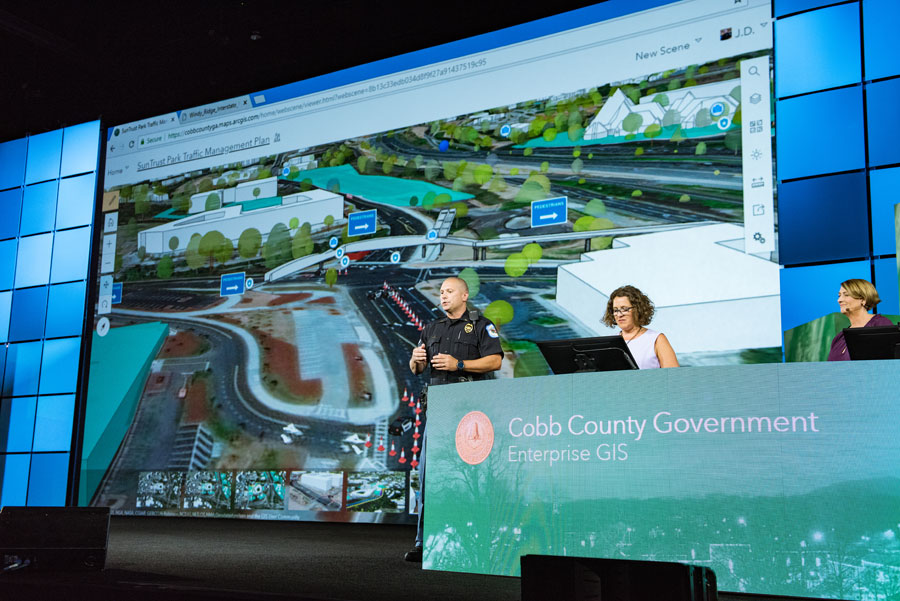At the end of each game, Lieutenant J. D. Lorens from the Cobb County Police Department monitors the flow of pedestrians exiting the stadium. Lorens uses a dashboard that shows maps, charts, and live security camera footage. With all this information readily available, he knows exactly when to change the traffic lights to red at a certain intersection to minimize pedestrian pileups and vehicle queues.