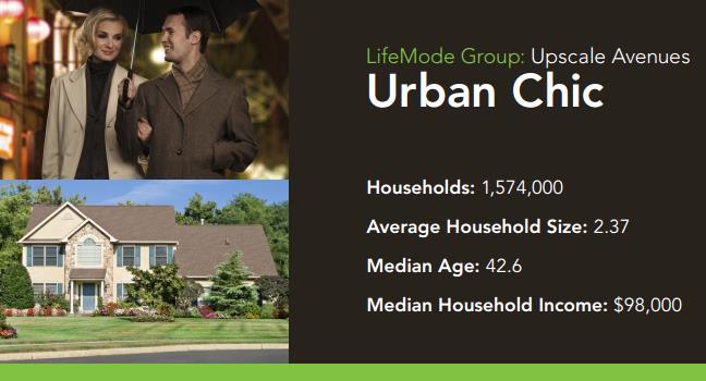 Residents of Tapestry’s Urban Chic neighborhoods see films at the theater. These well-educated, married couples and singles live in the suburbs of major metros on both coasts. Professional and managerial positions in the technical and legal occupations fund their exclusive, upscale, and sophisticated lifestyles. Leisure time is spent visiting museums, traveling, drinking imported wine, going to the movies, skiing, and practicing yoga.
