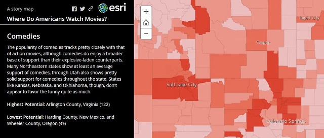 Drama, comedy, romance, action, horror, or family movies—each category has devoted fans. Esri’s Market Potential and Tapestry Segmentation data was used to create this interactive map of the US by county that shows areas where movie fans are located along with basic demographics and their favorite genre. See where your county ranks for each category.