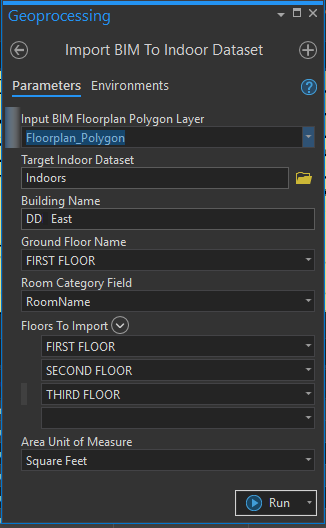 Then, select the floors to load into the ArcGIS Indoors layers with the ‘Floors To Import’ parameter.