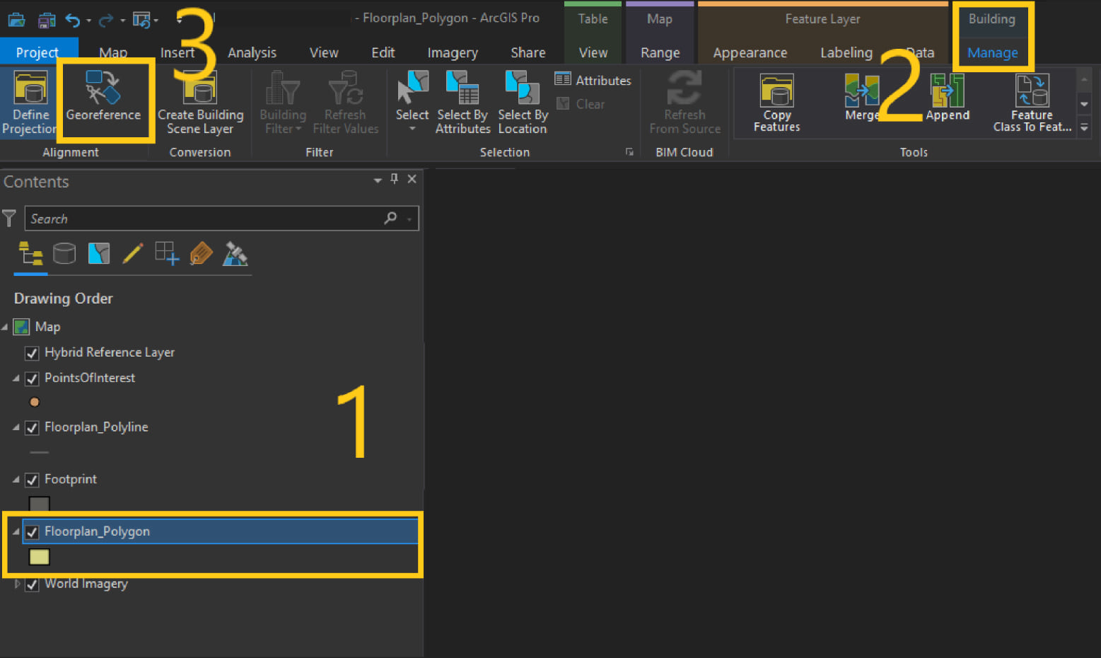 Make sure to add and work with the floorplan data in a 2D map, as it will provide accessibility to the ‘Building Management Toolbar’ for georeferencing and reprojecting the floorplan data.