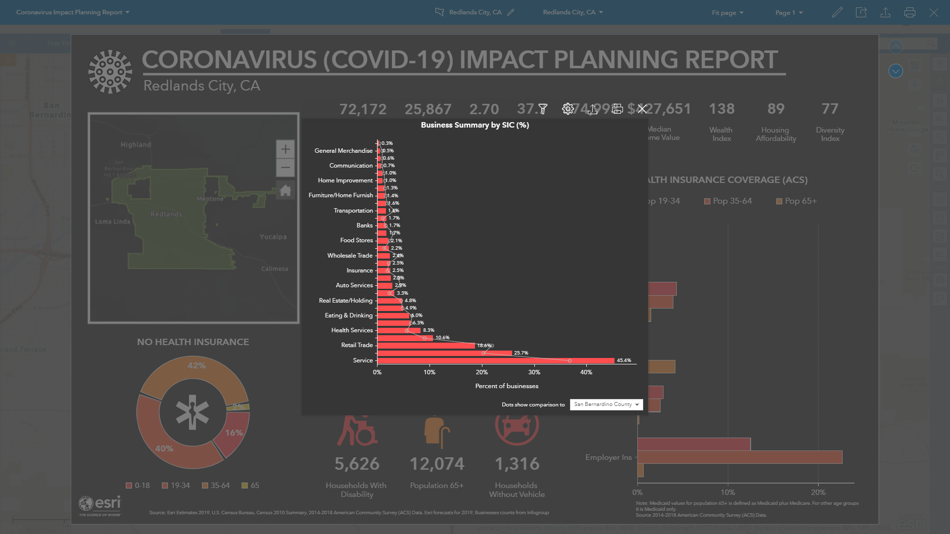 The infographic will now be generated, and all the charts, tables and panels populated with specific insights for the City of Redlands. The infographic has two pages so you can explore the second page of insights using the navigation buttons on the right-hand side of the infographic view.