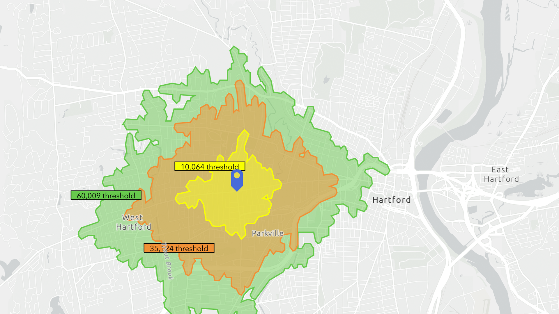 A threshold area is useful because it geographically represents the desired value of a given variable around the chosen location. You might, for example, want to know what area around a location includes a population of 25,000 people or what area represents a Consumer Spending value of $1,000,000.00. Such an area might be the perfect fit for the new location of a business, a new health clinic, or a new warehouse. Using these insights, you are truly leveraging the “Science of Where” in your decision-making processes.