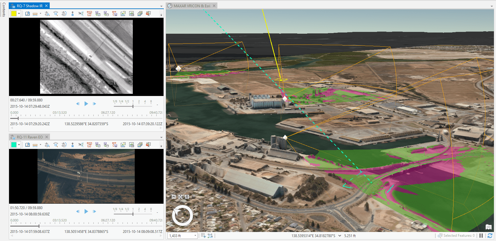 Using FMV in tandem with MAXAR’s 3D data enables users to analyze video data quickly and easily from multiple perspectives. For example, users can view both the FMV perspective viewpoint and the viewpoint of someone on the ground who is identifying the vehicle’s position and visibility.