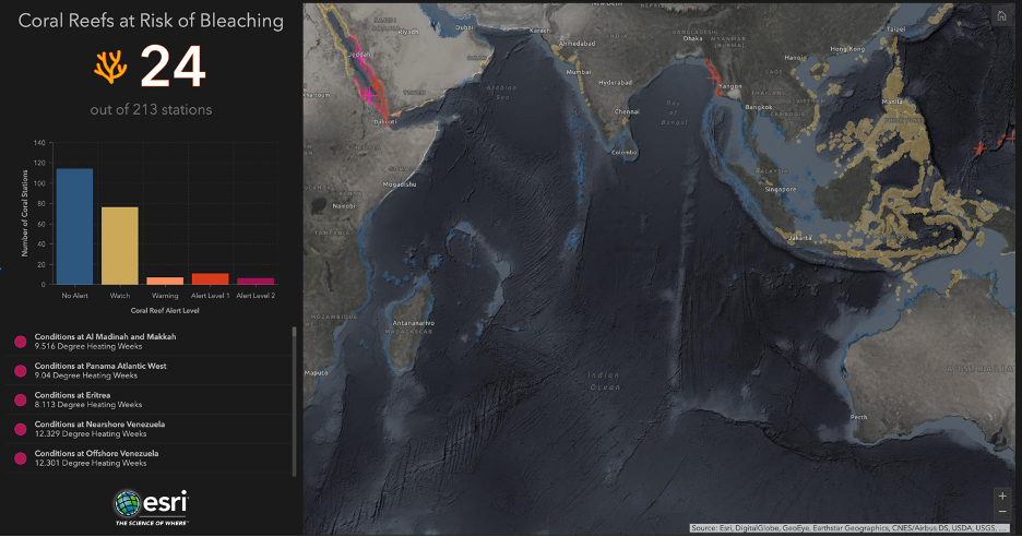 Another useful dashboard, Coral Reefs at Risk of Bleaching, shows the locations of the world’s coral reefs. This dashboard uses sea surface temperature data from NASA’s Coral Reef Watch Program to display alert levels for areas where the ocean’s temperature might exceed a reef’s heat tolerance level. This dashboard is useful for policymakers and marine scientists who need to monitor real-time bleaching conditions in their waters to take swift conservation action.