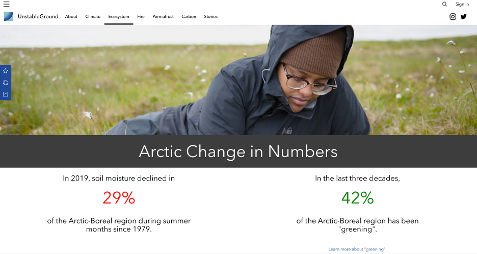 Lastly, ArcGIS Hub is a tool that brings open data, web apps, dashboards, StoryMaps, and more into one online platform to help science organizations engage and collaborate more effectively with their communities. In this tab, you can explore hub sites such as Unstable Ground built by Woodwell Climate Research Center. The site uses dashboards, maps, and stories to showcase how the Arctic is altered by climate change.
