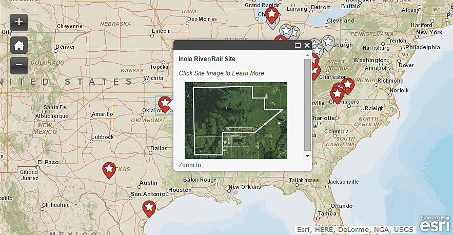 A tab on the page allows users to switch from the static map gallery to an interactive certified sites map. AEP created this responsive map using the WordPress plug-in for ArcGIS Online. The pop-up for each AEP certified site—which includes the site’s name and an aerial photo—allows users to either zoom in to the site on the map or open the particular certified site page in a new tab.